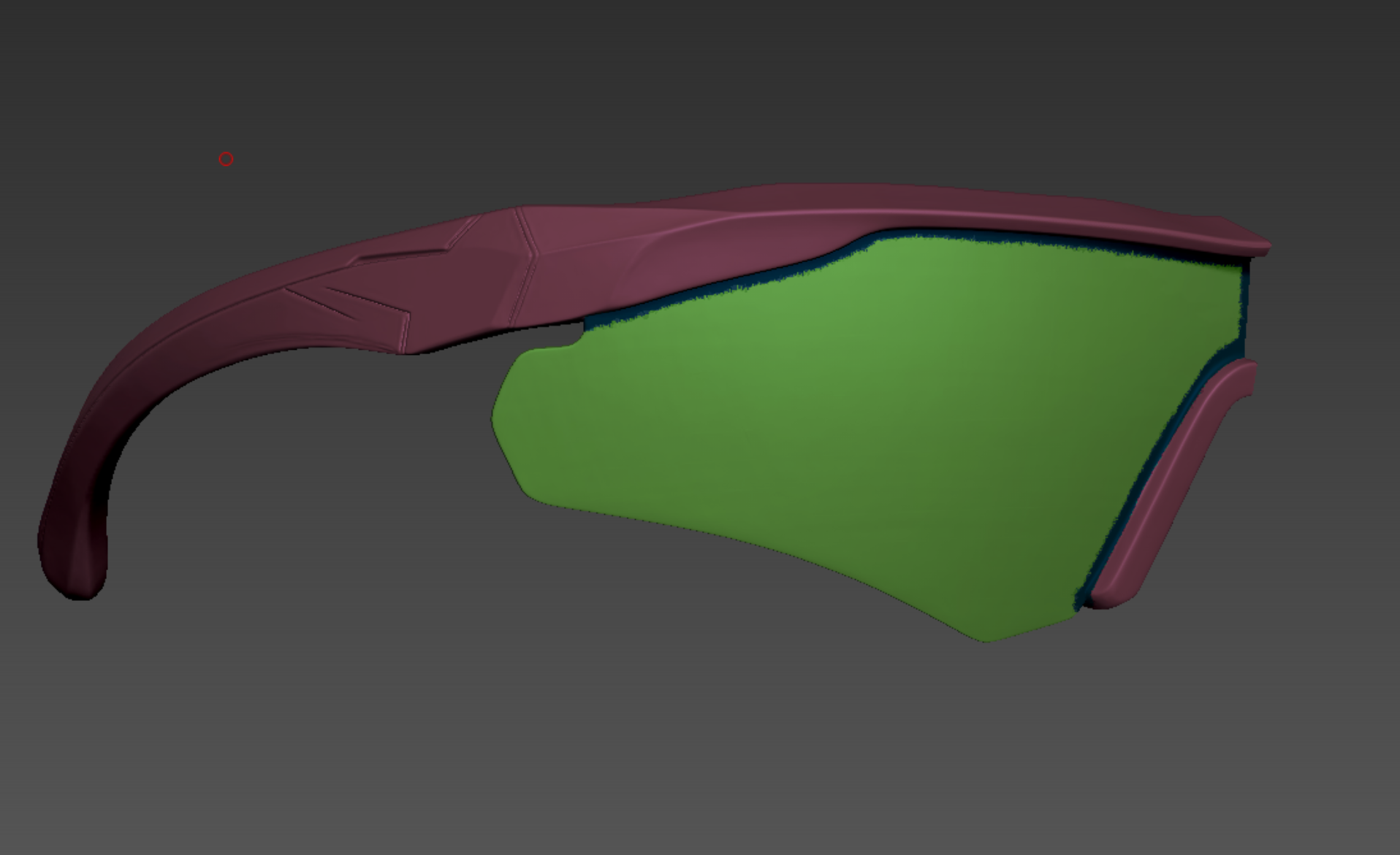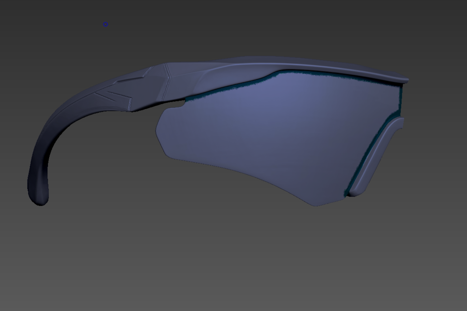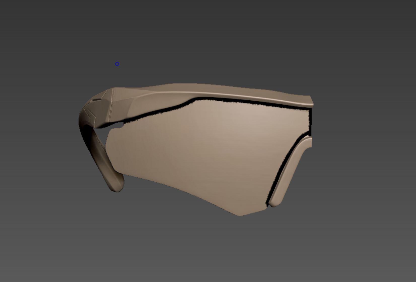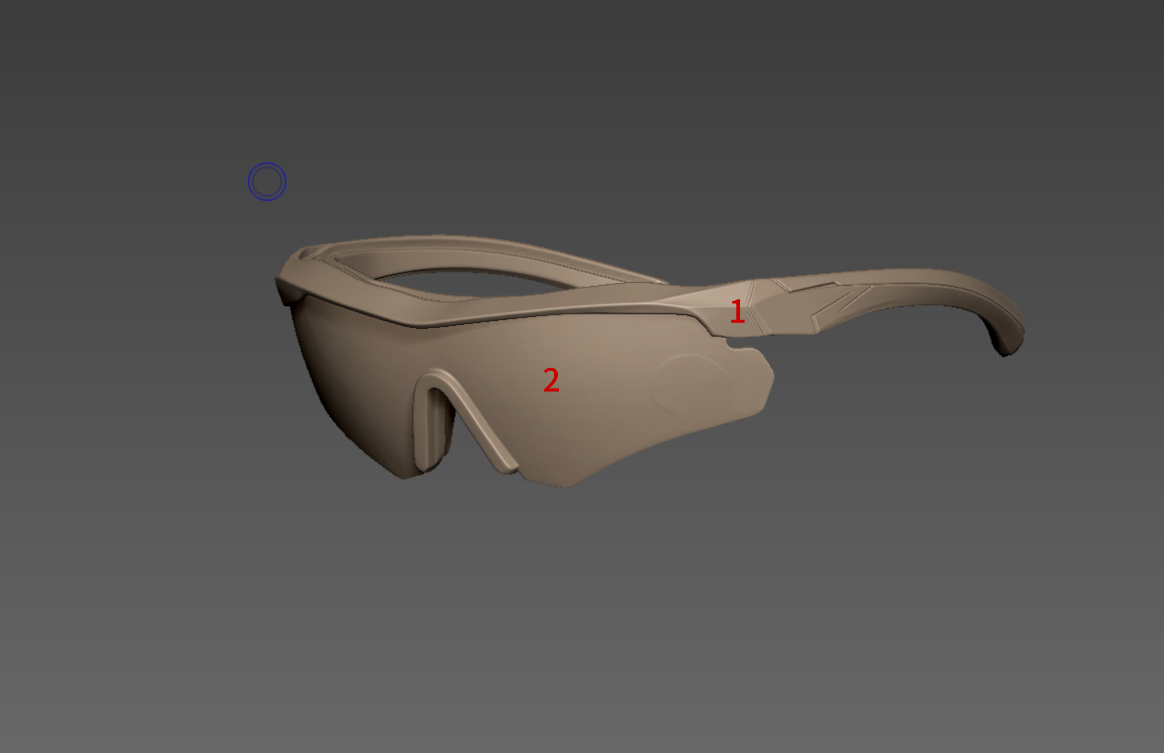 Here is the view from the ZBrush viewport. First, I’m going to separate the merged AI model into two parts—the lenses and the frames—using the Grouping function I mentioned earlier.